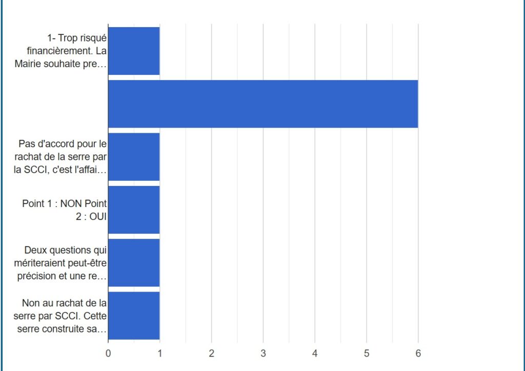 L’assemblée générale, après avoir pris connaissance du rapport du conseil de gouvernance relatif à l’achat de terrains agricoles pour mise à disposition de porteurs de projet et du tableau récapitulatif présenté au Bureau municipal le 14 septembre dernier, donne son accord pour l’achat par la SCCI Terres Islaises des terres agricoles nécessaires à la réalisation des projets de Renan Pointeau, Marianne Courbin, Ben Bonneau et Eliott Roussely, Isabelle Chailan et le projet coopératif de Jardins Nourriciers, que ce soit auprès de la commune de l’Ile d’Yeu en contrepartie de parts sociales, ou auprès de particuliers.